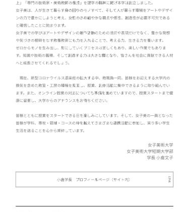 女子美術大学HP掲載の小倉学長からのメッセージ。